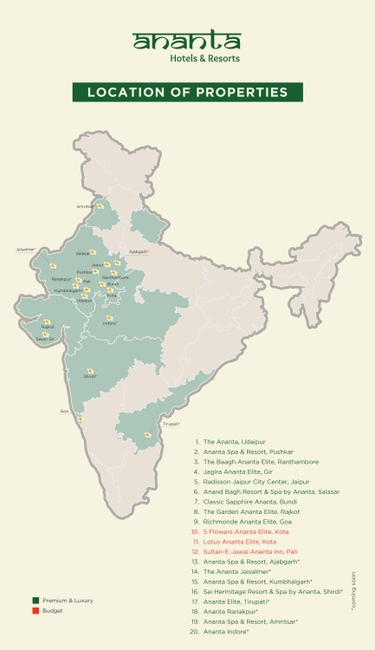 Ananta Global Hospitality is an extension of Ananta Hotels & Resorts. At Ananta Global, we collaborate with preexisting properties and uplift them through Ananta’s Management. We tend to add Ananta’s flavour to these properties so that they get the appreciation they deserve. We have three branches under Ananta Global Hospitality - Elite, Express, and Inn. We categorize properties based on their infrastructure, number of rooms and past performance.